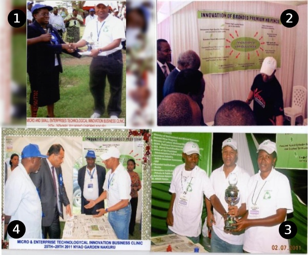 Clockwise: (1). Congratulatory hand shake from the Vice Chancellor of Kenyatta University Prof. Mabel O. Imbuga. (2). Presentation to the late Former President of the Republic of Kenya His Excellency, Mwai Kibaki. (3). Davies and Team displaying the Trophy they Won for their outstanding innovation project. (4). Davies and team receive to the stand, Prof. Shaukat A. Abdulrazak, C.E.O Kenya's National Commision for Science Technology and Innovation (NACOSTI)